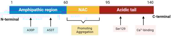 A schematic figure about the structure of α-synuclein is shown in Figure 1. The protein can be divided into three distinct domains: The N-terminal amphipathic domain, which contains the evolutionary conserved KTEGV motifs and the main mutations associated with familial PD, such as A53T and A30p []. This region is responsible for membrane binding as well. Additionally, there is a central hydrophobic segment known as the non-amyloid component (NAC), which confers the potential for a β-pleated sheet, and a highly negatively charged carboxyl tail at the C-terminal end, which contains a Ca2+-binding site and the main phosphorylation site at Ser129, modulating α-synuclein aggregation. The hydrophobic NAC region, in particular, is critical for the protein’s propensity to adopt β-sheet configurations that can self-assemble into fibrillar aggregates, forming the core of LBs, a pathological hallmark found in PD brains []. Once α-synuclein fibrils are established in a neuron, they can act as a guide for the aggregation of endogenous α-synuclein protein [], further initiating PD progression.
