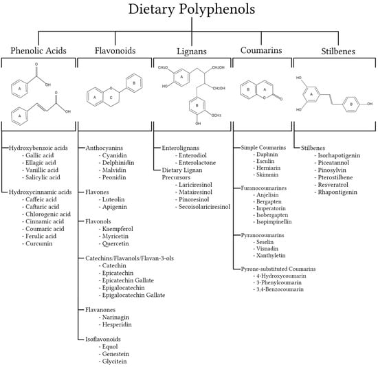 Polyphenols are highly specific secondary metabolites of plants that have a variety of biological roles, from resistance to infection by pathogenic microorganisms to defense against ultraviolet radiation []. Generally speaking, “polyphenol” refers to compounds derived entirely from the shikimate/phenylpropanoid pathway and/or the polyketide pathway, characterized by the presence of more than one phenolic unit and devoid of nitrogen-based functions []. To date, thousands of polyphenols have been identified from natural dietary plants. In general, polyphenols are mainly classified as phenolic acids, flavonoids, lignans, coumarins, and stilbenes, as outlined in Figure 3 []. The presence of polyphenol compounds in food greatly depends on environmental factors and food processing, production, and storage [].