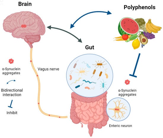 The interactions between polyphenols, the gut–brain axis, and α-synuclein (created with https://www.biorender.com, on 21 May 2024).