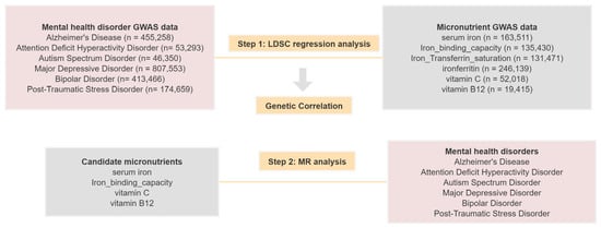 The mental health disorders included in our study were selected based on their high public health burden, the availability of genetic data, and the known or hypothesized association with micronutrient levels. Six neuropsychiatric traits were enrolled from the largest recent GWASs, including Alzheimer’s disease (AD) [22], attention-deficit/hyperactivity disorder (ADHD) [23], autism spectrum disorder (ASD) [24], major depressive disorder (MDD) [25], bipolar disorder (BIP) [26], and post-traumatic stress disorder (PTSD) [27]. The GWAS summary data for these disorders were acquired from the Psychiatric Genomics Consortium (PGC) website (https://www.med.unc.edu/pgc, accessed on 6 April 2023). The GWAS data for six mental health disorders is as follows: 455,258 AD individuals (71,880 cases and 383,378 controls); 53,293 ADHD individuals (19,099 cases and 34,194 controls); 46,350 ASD individuals (18,381 cases and 27,969 controls); 807,553 MDD individuals (246,363 cases and 561,190 controls); 413,466 BIP individuals (41,917 cases and 371,549 controls); and 174,659 PTSD individuals (23,212 PTSD cases and 151,447 controls). All subjects were of European descent. Details about genotyping, imputation, quality control, and genetic association analysis were described in the primary studies [22,23,24,25,26,27].