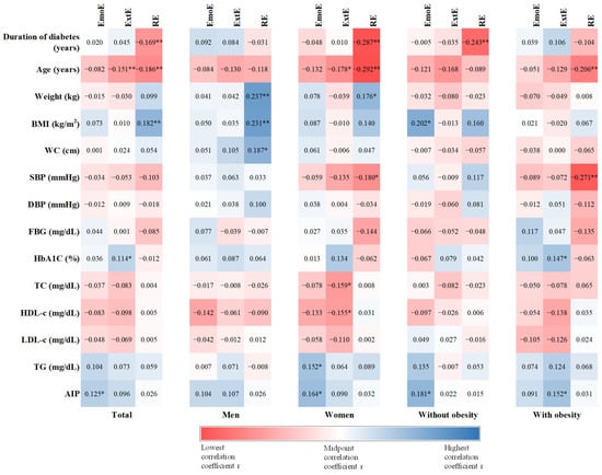 Heat map of Spearman correlation between eating behavior and anthropometric and biochemical data. Correlation coefficient r is presented in the square and the strength of correlation is depicted in color, with red being the lowest and blue the highest correlation coefficient. Statistical significance: * p < 0.05, ** p < 0.01. EmoE—Emotional eating, ExtE—External Eating, RE—Restrained Eating, BMI—body mass index, WC—waist circumference, SBP—systolic blood pressure, DBP—diastolic blood pressure, FBG—fasting blood glucose, HbA1C—glycated hemoglobin, TC—total cholesterol, LDL-c—low-density cholesterol, HDL-c—high-density cholesterol, TG—triglyceride, AIP—atherogenic index of plasma.
