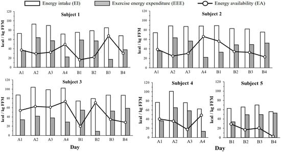 Figure 1 shows the EA, EI, and EEE, normalized to FFM, estimated prior to each period. EA was generally highest on days with the lowest EEE, except for subject 3, who showed an exceptionally high EA (70.5 kcal/kg FFM/day) on the day with the lowest EEE. For subject 5, EA remained < 30 kcal/kg FFM/day throughout the 4-day measurement period.