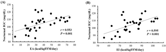Figure 2 shows the correlations of daily mean nocturnal IGC with both daily EA and EI over 32 instances. During the measurement periods, subjects did not consume any food or beverages from 9:00 p.m. to 6:00 a.m. Significant correlations were observed between daily mean nocturnal IGC and daily EA (r = 0.553, p = 0.001), as well as EI (r = 0.595, p < 0.001). When the data (n = 32) were segregated into days with EA ≥ 30 kcal/kg FFM/day (n = 20) and <30 kcal/kg FFM/day (n = 12), days with EA < 30 kcal/kg FFM/day exhibited significantly lower nocturnal IGC compared to days with EA ≥ 30 kcal/kg FFM/day (97 ± 10 mg/dL vs. 109 ± 6 mg/dL, p < 0.001). However, no significant relationships were found between daily mean nocturnal IGC and daily CHO intake (g/kg BW) (r = 0.319, p = 0.075) or EEE (r = −0.278, p = 0.124).