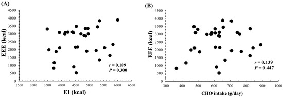 Figure 3 shows the relationships of daily EEE with both daily EI and CHO intake. There was no significant correlation between daily EEE and daily EI (r = 0.189, p = 0.300) or CHO intake (g/day) (r = 0.139, p = 0.447). Additionally, daily protein intake (g/day) (r = 0.094, p = 0.609) and fat intake (g/day) (r = 0.141, p = 0.441) also showed no significant correlations with daily EEE.