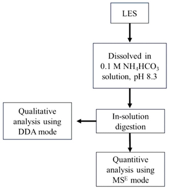 The strategy employed to perform the proteomic analysis of the LSE is schematized in Figure 1. The sample was prepared by dissolving 4 mg of LSE in 250 µL of 0.1 M NH4HCO3 solution, pH 8.3, to a total protein concentration of 12 µg/µL.