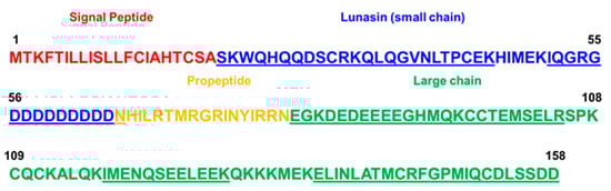 In our qualitative analysis, we identified peptides comprising the sequences of both small (with a sequence coverage of 88.6%) and large (with a sequence coverage of 76.6%) chains (Figure 3). Notably, a peptide corresponding to the C-terminal of the lunasin, containing an asparagine residue, was also identified. This result indicated that lunasin present in the LSE had a length of 44 amino acid residues, consistent with findings in other studies that extracted lunasin from soybean [,]. The lunasin peptide corresponds to the small chain of the mature form of soybean 2S albumin. The precursor 2S albumin sequence constitutes a signal peptide, a small chain, a propeptide and a large chain (Figure 3) []. This protein is processed by proteolytical cleavage, and its mature form constitutes the small (lunasin) and large chains connected by disulfide bonds. In a study by Serber et al., the mature form of the 2S albumin (14 kDa) in soybean extract was identified, emphasizing the importance of including a reducing step in the purification of lunasin from soybean extract to recover this peptide separately [].