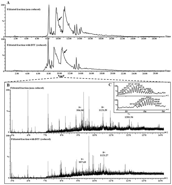 Analysis of the 2S albumin large chain in the filtrated non-reduced and reduced lunasin-enriched soybean extract (LSE) samples by LC–MS. (A) Base peak ion chromatograms of the filtrated non-reduced and reduced LSE samples. Arrows indicate the time of elution of the 2S albumin large chain. (B) Mass spectra of 2S albumin’s large chain in both the non-reduced and reduced LSE samples obtained from chromatograms at the times 10.05 and 10.99 min, respectively. (C) Comparison of the mass spectra of 2S albumin’s large chain in both the non-reduced and reduced LSE samples for 9+ charged species.