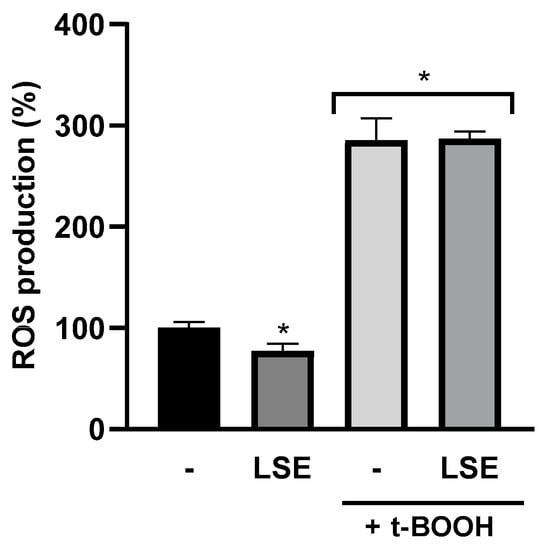 Antioxidant effects of lunasin-enriched soybean extract (LSE) in AGS cells. Effects of LSE (0.065 mg protein/mL) on reactive oxygen species (ROS) production (expressed as %) in AGS cells under basal conditions and chemically challenged with tert-butyl hydroperoxide (t-BOOH, 2.5 mM). The negative control indicates 100% ROS production. * p ˂ 0.0001.