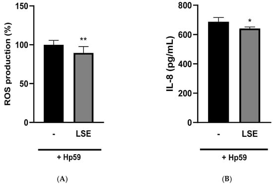 In contrast to what was observed in chemically induced AGS cells, the LSE significantly reduced the generation of ROS in Hp59-infected cells by 10.4% (Figure 7A).