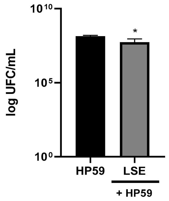 The antimicrobial activity of LSE against H. pylori was carried out according to the following: 1 mL of LSE samples (final concentration 1 mg/mL) was dissolved in water and filtered through 0.22 μm filter units, mixed with 4 mL of BB supplemented with 10% HS in a conical flask. Bacterial biomass grown in plates was diluted in 2 mL of BB supplemented with 10% HS, under aseptic conditions, and this bacterial inoculum was added (100 μL, ~1 × 108 CFU/mL). The conical flasks were incubated under agitation (150 rpm) in a microaerophilic atmosphere using a VAIN at 37 °C for 24 h. Positive growth controls were prepared with 1 mL of water in 4 mL of BB supplemented with 10% HS and 100 μL of bacterial inoculum. A negative control was prepared with 5 mL of BB supplemented with 10% HS. After incubation, serial decimal dilutions were prepared in saline solution (0.9% NaCl) and 20 μL of each was seeded on plates of MHB agar and incubated in a microaerophilic atmosphere (VAIN) at 37 °C for 120 h. All samples were analyzed in quadruplicate (n = 4). After 120 h of incubation, the number of CFUs was evaluated and the results were expressed as the logarithm of CFU per mL (log CFU/mL).