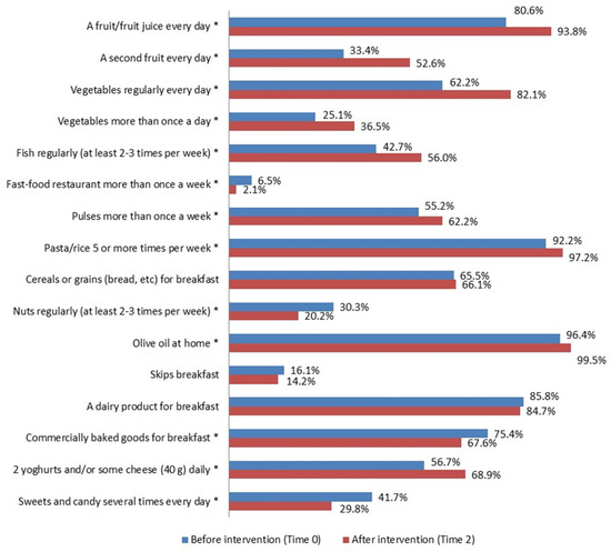KIDMED test before (Time 0) and after the intervention (Time 2) in the intervention group (%). * p ≤ 0.05, McNemar test for differences between correlated proportions, before (Time 0) and after the intervention (Time 2).