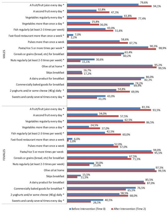 KIDMED test before (Time 0) and after the intervention (Time 2), by sex (%) in the intervention group. * p ≤ 0.05, McNemar test for differences between correlated proportions, before (Time 0) and after the intervention (Time 2).