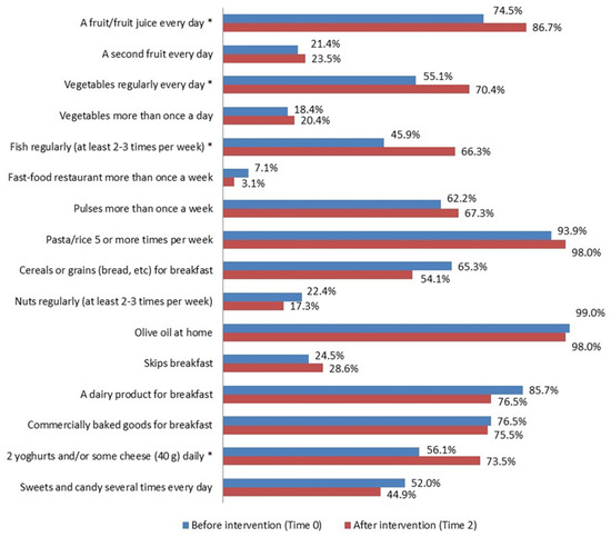 An improvement in some eating habits (Figure 5) supported by statistical significance was also observed in the control group (Time 0 vs. Time 2). Those of interest for the assessment were: -a fruit or fruit juice every day (74.7% vs. 86.7%, p = 0.008); -fresh or cooked vegetables regularly once a day (55.1% vs. 70.4%, p = 0.012); -fish regularly 2–3 times a week (45.9% vs. 66.3%, p = 0.003); -2 yogurts and/or some cheese (40 g) daily (56.1% vs. 73.5%, p = 0.005).