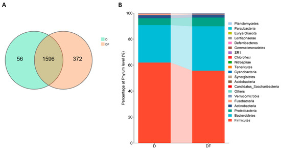 Distribution of identified intestinal flora in dementia (D) and dementia-free (DF) groups. (A) Venn diagram showing the distribution of OTUs between D and DF group. (B) Intestinal flora composition of the two groups at the phylum level.