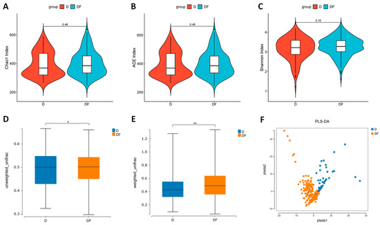 Furthermore, an evaluation was conducted to compare the gut flora diversity between the two groups. The alpha diversity of the flora was assessed utilizing Chao1, ACE, and Shannon indices. D and DF groups showed no statistically significant variances in alpha diversity (p > 0.05, Figure 2A–C). The beta diversity index was utilized to assess the variation in species abundance distribution between the groups. The findings indicated a notable divergence in the composition of intestinal flora between the D and DF groups (Figure 2E,F), with the D group exhibiting lower beta diversity compared to the DF group (p < 0.05, Figure 2D,E). Therefore, there is a notable discrepancy in the abundance distribution of intestinal flora between the two groups. Specifically, patients with dementia exhibit decreased diversity in their intestinal flora, meaning specific alterations in the distribution of abundance of certain flora.
