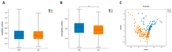 Comparisons of intestinal flora diversity between the LQ and HQ groups. The beta diversity based on (A) unweighted and (B) weighted UniFrac distances analysis between HQ and LQ group. (C) PLS−DA analysis of intestinal flora between HQ and LQ group. ** p < 0.001.