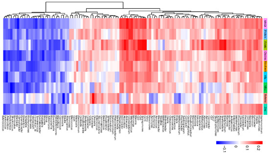 Subsequently, in order to investigate the relationship between the specific gut microbiota and MDNs, the relative abundance of gut microbiota was analyzed at the genus level. We then conducted a preliminary screening to identify gut microbiota influenced by micronutrient-dense nutrients, based on the presence of statistically significant differences in the correlation between the genera and MNQI or MDNs’ intake. Given the necessity of incorporating a greater number of potential flora in the screening phase to facilitate a broader selection for subsequent comprehensive investigations, it was determined that a statistical divergence in flora screening occurred at a significance level of p < 0.1. Figure 4 illustrates the initial screening of 115 candidate genera, which were subsequently categorized into two clusters based on their correlation with MDNs’ intake. Specifically, 85 genera exhibited a positive correlation with MDNs’ intake, while 30 genera showed a negative correlation. Among these genera, Gp16, Sphingomonas, Gp6, and Allobaculum exhibited significant positive correlations with the intake of MDNs, particularly demonstrating strong associations with the MNQI and folate intake. Conversely, genera such as Clostridium_XI and Maribacter displayed notable negative correlations with the MNQI. Furthermore, a consistent trend was observed where the MNQI and MDNs’ intake influenced the relative abundance of these genera, either up-regulating or down-regulating their presence.