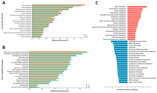 Significant differences between the D and DF groups at the third level of the KEGG pathway, p < 0.1. Compared with the DF group, the relative abundance of (A) up−regulated pathways and (B) down−regulated pathways of the KEGG pathway’s functional genes in D group. (C) Differences in the enrichment level of the KEGG pathway’s functional genes. Up−regulated functional genes in the D group compared to the DF group are labeled by red and down−regulated by blue.