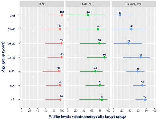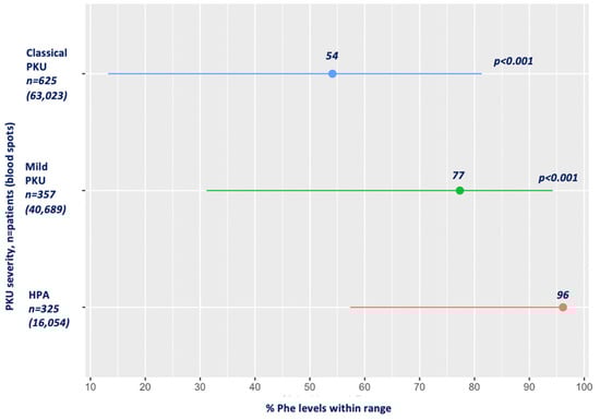 Figure 1 presents the mean percentage of blood Phe levels within the target range for HPA, mPKU and classical PKU. Compared to patients with HPA, in whom 96% of the blood Phe levels were within the target, the mean percentage of Phe levels within the therapeutic target range in both mPKU and classical PKU was significantly lower (77% and 54%, respectively; p < 0.001) for all age ranges.