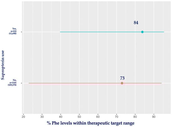 The comparison of the mean percentage of blood Phe levels within the therapeutic target range in the sapropterin and diet-only treatment groups as analysed by age is shown in Table 8. In the sapropterin group, patients were able to achieve a high percentage of blood Phe levels (≥75%) within the therapeutic target range at all ages (range: 76–93%), particularly during adolescence (13–18 years) and late adulthood (>41 years), with more than 90% of the blood Phe levels meeting the target range. In contrast, in the diet-only-treated group, metabolic control was acceptable until the end of adolescence, as reflected by the high percentage of blood Phe levels within the target (range: 72–89%). However, it deteriorated in adulthood, with only 39–59% of Phe levels within the therapeutic target range.