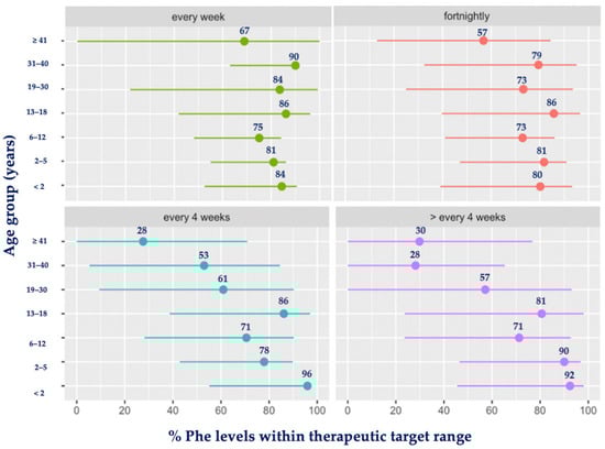 Mean percentage (%) of blood Phe levels within target range by age group and frequency of monitoring. Abbreviations: Phe, phenylalanine. Green: each week; red: fortnightly; blue: every 4 weeks; purple: >every 4 weeks.