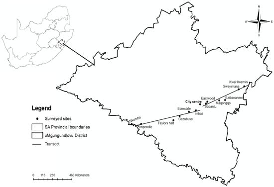The study was conducted in Pietermaritzburg, Msunduzi Municipality, in uMgungundlovu District (29.6006° S, 30.3794° E) in the KwaZulu-Natal province of South Africa. Twelve sites were selected to create a rural–urban gradient [17]. The sites representing the urban settlements lay within 10 km from the city center, while the peri-urban residential areas were located between 10 and 40 km from Pietermaritzburg city center. The rural settlements were between 40 and 70 km from the city center. The sites representing the rural environment were Impendle, Nkumba, Swayimana, and KwaHlwemini, while Gezubuso, Taylors Halt, Maqongqo, and Ezibananeni were regarded as peri-urban settlements, and Imbali, Edendale, Sobantu, and Eastwood represented urban areas. Rural areas have agricultural potential but are mostly suitable for animal husbandry. Poor secondary roads (gravel) that are not conducive for transport, especially in rainy conditions, are common. Most of the households use pit toilets, and the areas are distant from the city center.