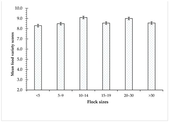 The FVS was affected by village chicken flock sizes (Figure 2). The food variety score was the highest (9.10 ± 0.29) in households that had a flock size of 10–14 chickens (p > 0.05). The FVS was the lowest (8.30 ± 0.34) in households that had a flock size of less than five chickens (p > 0.05).