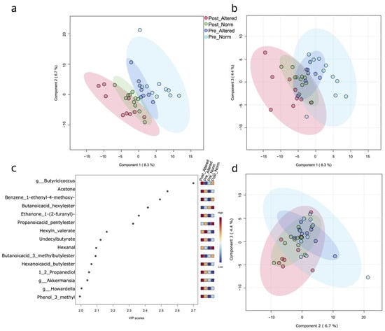 PLS-DA plot. A normalized matrix composed of fecal and urine metabolites, plus 16S taxa, was used as input for the PLS regression analysis. (a) Component 1 versus component 2 PLS-DA score plot based on 16S metataxonomic and metabolomics (fecal and urinary VOCs) variables. (b,d) Relative to other component combinations and, precisely, component 1 vs. 3 and component 2 vs. 3, respectively. (c) Top fifteen “Variable Importance in Projection” (VIP) scores, including both VOCs and microbiome taxa with a value greater than 2.0.