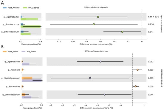 Extended error bar plots of statistically significant bacterial genera that differed as a consequence of VLCKD dietary treatment in post-altered versus pre-altered samples (A) and post-versus pre-normal samples (B). Both the plots report the effect size and associated confidence interval for each significative feature (corrected p < 0.05) obtained in STAMP software by applying corrected Welch test (BH) statistics based on the normalized matrix from QIIME2. Difference in genus mean proportions (95% of confidence intervals) resulted from a Welch pairwise test (corrected by applying a Benjamini–Hochberg multiple test). Post-treatment groups are colored light blue (post-altered) or orange (post normal), and green (pre-altered) or violet (pre-norm). All the reported genera were statistically significant after correction (corrected p < 0.05). Because of the direction of the comparison, the differences in mean proportion for pre-altered samples appeared as negative values.
