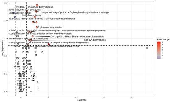 Log2 fold change vs. significance plot. Statistically significant Picrust2 pathways obtained by comparing post-altered and pre-altered sample groups visualized as a volcano plot. Fold change is indicative of increasing (red) and decreasing (violet) abundance in post-altered predicted pathways.