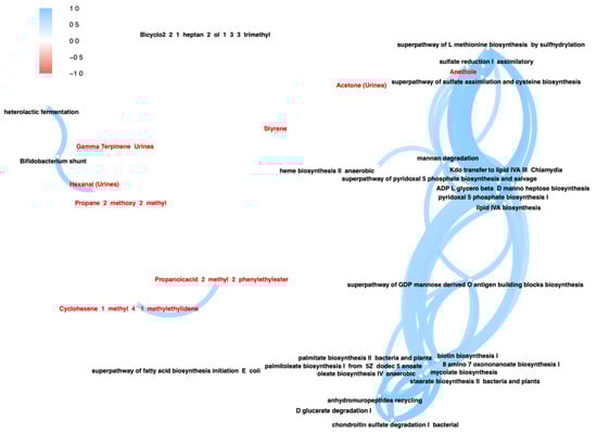With the aim of discovering the significant associations between VOCs and predicted pathways, we used the output of two separately run fold-change analyses. The network plot reported all the statistically significant linear cross-correlations computed based on Picrust2 pathways and fecal/urinary VOCs derived from comparing post-altered and pre-altered sample groups (Figure 4).