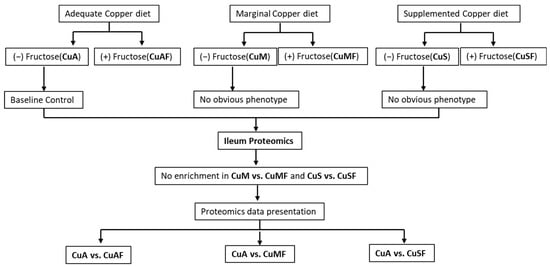 Male weanling Sprague Dawley rats (35–45 g) from the Harlan Laboratories (Indianapolis, IN, USA) were fed a purified AIN-76 diet ad libitum with a defined copper content in the form of cupric carbonate (with the calories comprised 69% carbohydrate, 12% fat, and 19% protein). The rats received 6.0 ppm (CuA, Cat# 115591, Dyets Inc., Bethlehem, PA, USA), 1.5 ppm (CuM, Cat# 115590, Dyets Inc., Bethlehem, PA, USA), or 20 ppm (CuS, Cat# 115592, Dyets Inc., Bethlehem, PA, USA) of copper from diets as adequate, marginal, or supplemental doses, respectively, for 4 weeks. The animals had free access to either deionized water or deionized water containing 30% fructose (w/v) (CuAF, CuMF, and CuSF) at the same time as the different doses of copper diets for 4 weeks. There were a total of 45 rats. Seven or eight of these rats were randomly assigned to each of the six groups (CuA, CuAF, CuM, CuMF, CuS, and CuSF) (Figure 1). The control animals were those fed adequate copper (CuA) with no added fructose. The animals were single-housed in stainless steel cages without bedding in a temperature- and humidity-controlled room with a 12:12 h light–dark cycle. The cage locations were equally distributed between the groups. The fructose-enriched drinking water was changed twice a week. After fasting overnight, all the animals were killed under anesthesia with pentobarbital (a 50 mg/kg I.P. injection). Blood was collected from the inferior vena cava, and the citrated plasma was stored at −80 °C for further analysis. Portions of the distal ileum were snap-frozen with liquid nitrogen and stored at −80 °C for the proteomics analysis. All the studies were approved by the University of Louisville Institutional Animal Care and Use Committee, which is certified by the American Association of Accreditation of Laboratory Animal Care.