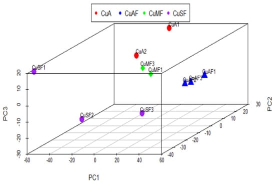 Principal component analysis (PCA) of the proteomics profile differences between different dietary groups: CuA, adequate copper; CuAF, adequate copper plus fructose; CuMF, marginal copper plus fructose; and CuSF, supplemented copper plus fructose.