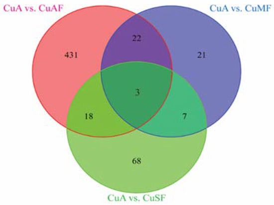 The numbers of the commonly and differentially altered proteins from different groups presented in a Venn diagram: CuA vs. CuAF (pink circle, 474), CuA vs. CuMF (blue circle, 53), and CuA vs. CuSF (green circle, 96). CuA, adequate copper; CuAF, adequate copper plus fructose; CuMF, marginal copper plus fructose; and CuSF, supplemented copper plus fructose.