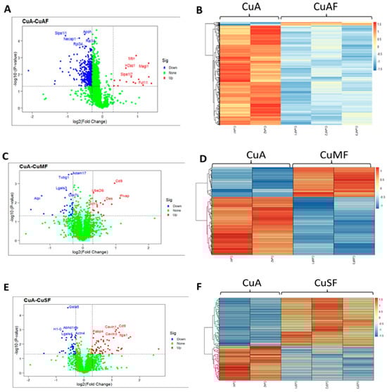 Volcano plots and heatmaps are presented showing the significantly upregulated and downregulated proteins. (A,C,E) Volcano plots from different group comparisons. The blue points denote the significantly downregulated proteins (p < 0.05 and log2 fold change < −0.3); the red points denote the significantly upregulated proteins (p < 0.05 and log2 fold change > 0.3); and the green points represent the proteins without significant change. (B,D,F) Heatmaps of DEPs from different group comparisons. The sample cluster heatmap analysis was performed with hierarchical clustering using the Pearson correlation method. Dark orange represents the upregulated proteins, while light blue represents the downregulated proteins. (A,B) CuA vs. CuAF; (C,D) CuA vs. CuMF; and (E,F) CuA vs. CuSF. CuA, adequate copper; CuAF, adequate copper plus fructose; CuMF, marginal copper plus fructose; and CuSF, supplemented copper plus fructose.