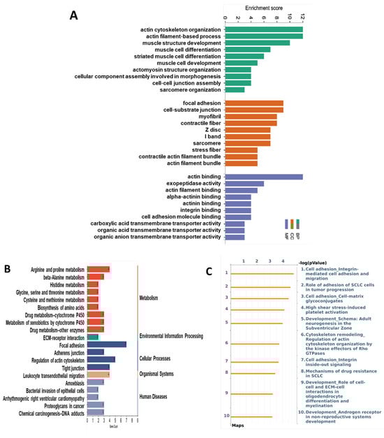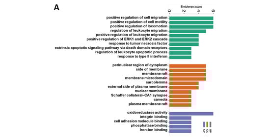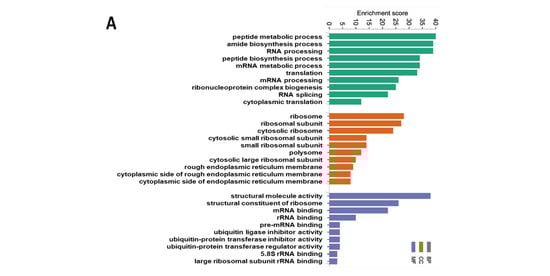 The list containing the identified differentially expressed proteins (DEPs) was submitted to functional enrichment analyses. The Gene Ontology (GO) and Kyoto Encyclopedia of Genes and Genomes (KEGG) enrichment analyses were performed using Metascape [https://metascape.org/gp/index.html#/main/step1 (accessed on 23 February 2023)]. The significantly altered GO functions and KEGG pathways with a p < 0.05 were identified. To further understand the biological significance of the DEPs, the MetaCore Database Analysis Platform [https://portal.genego.com/ (accessed on 23 February 2023)] was used to analyze the canonical pathways through the enrichment function of the Pathway Maps of DEPs. The pathway significance was set to p < 0.05.