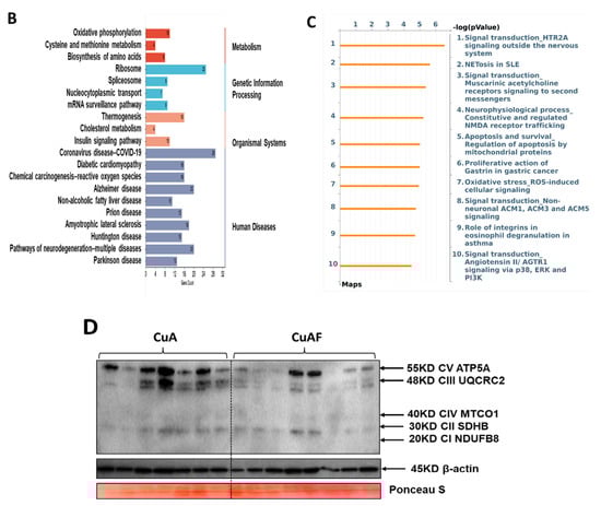 Functional enrichment and pathway enrichment analysis of the DEPs between the CuA and CuAF groups. (A) Gene ontology (GO) enrichment analysis; (B) top 20 from the Kyoto Encyclopedia of Genes and Genomes (KEGG) pathways analysis results using Metascape; (C) top 10 pathways assessed using MetaCore, with the significance of the pathways being shown by the −log(p-value); and (D) a western blot of the expression of mitochondrial OXPHOS complexes I to V. CuA, adequate copper; CuAF, adequate copper plus fructose; and CI-CV, complex I to complex V.