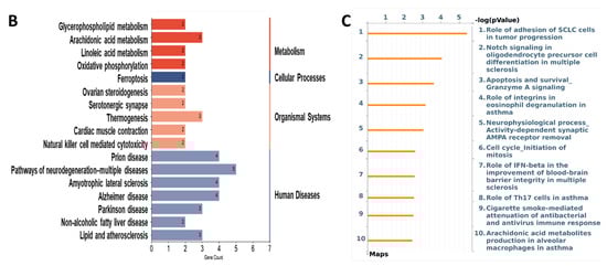 The top 10 GO terms by the CuMF in the BP and CC are presented in Figure 6A; however, only five GO terms in the MF were enriched by the CuMF. Among them, the GO terms involved in the BP included the positive regulation of cell migration, positive regulation of cell motility, positive regulation of locomotion, and regulation of leukocyte migration. The GO terms involved in the CC included the perinuclear region of cytoplasm, side of membrane, membrane raft, and membrane microdomain. The top enriched GO terms in the MF included oxidoreductase activity, integrin binding, cell adhesion molecule binding, phosphatase binding, and iron–ion binding. A total of 17 pathways were enriched by the CuMF as shown through the KEGG pathway analysis. Among them, arachidonic acid metabolism was identified to be the top enriched metabolic pathway. In addition, linoleic acid metabolism, oxidative phosphorylation, and ferroptosis were also enriched by the CuMF compared to the CuA (Figure 6B and Supplementary Table S2). Among the top 10 enriched pathways identified by MetaCore (Figure 6C and Supplementary Table S2), arachidonic acid (AA) metabolism seems to be a common pathway identified by both the KEGG and MetaCore, highlighting a specific role of AA metabolism in CuMF-induced gut barrier function.