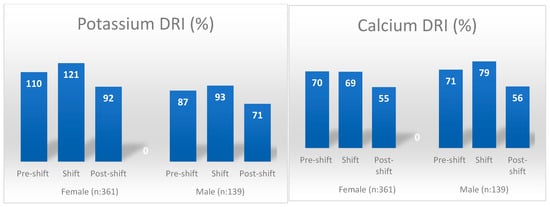 Minerals with the lowest DRI percentage by gender and shift days. DRI: dietary reference intakes.