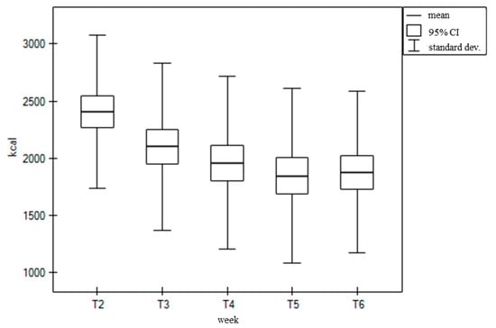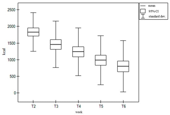 The average daily value of energy and nutrient intake in the following weeks of the patients’ treatment was significantly reduced in the vast majority of cases. The average value of energy consumed after the first week of the patients’ treatment was 1847.01 kcal per day. By the final week, this average had dropped to just 809.47 kcal per day, which was 43.8% of the value from T2. The changes that occurred in the overall energy intake during the following weeks of treatment are shown in the following figure (Figure 1).