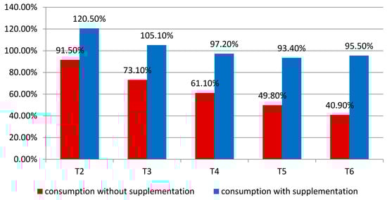 There was a significant decrease in energy intake during the subsequent weeks of the patients’ treatment. At T2, the average intake without FSMP and EN accounted for 91.5% of the patients’ average requirements, while at T6, this ratio dropped to only 40.9% of the requirements. For intake with FSMP and EN, in the second week, the average energy value of the meals consumed was 120.5% of the requirement. In the last week of treatment, intake from FSMP and EN accounted for 95.5% of the energy requirements. These data are presented in the figure (Figure 3).