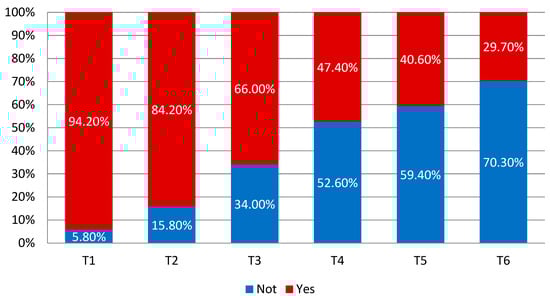 The proportion of the patients consuming orally more than 60% of their daily energy requirements declined steadily in the subsequent weeks of the therapy administered. In the first week, 94.2% of the patients met this criterion, while in the last week (T6) only 29.7% of the patients did. The weighted average of the time elapsed before the onset of the inability to consume 60% of the daily energy requirements was 4.5 weeks. Differences in the percentage of the patients realizing an energy intake above 60% of the requirements in successive weeks of treatment proved to be statistically significant (<0.001). The changes occurring in this regard are shown in the figure (Figure 4).