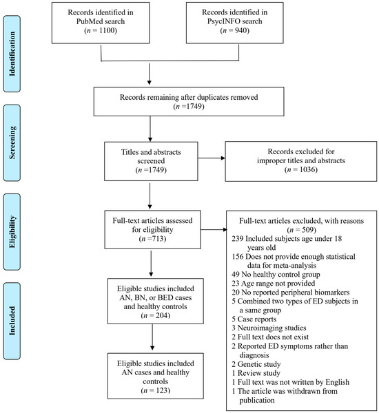 As the original search included individuals with AN, BN, and BED, the PRISMA flowchart in Figure 1 summarizes the study selection process of all three conditions and the final result for AN only. The search strategy resulted in 2040 studies for initial consideration in the meta-analysis. After removing 291 duplicate studies, 1749 studies remained. After screening titles and abstracts, 1036 studies were excluded, and 713 studies underwent full-text assessment for eligibility. By examining the full texts of the remaining 713 studies, 509 studies were excluded due to the reasons listed in Figure 1, leaving 204 studies that included adults with AN, BN, or BED and healthy controls. Out of the 204 studies, we included 123 studies reporting peripheral biomarkers from AN cases and control groups in the current study (Supplemental Document S2).