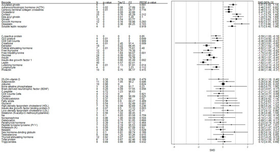 Table 1, Figure 2, and Supplemental Document S3 present meta-analysis results for the 52 peripheral biomarkers. The Q homogeneity test was significant for 25-OH-vitamin D, adiponectin, bone alkaline phosphatase, C-peptide, calcium, cholecystokinin, cholesterol, cortisol, creatinine, estradiol, fatty acids, follicle-stimulating hormone (FSH), free thyroxine, free triiodothyronine, ghrelin, glucose, glycerol, GH, high-density lipoprotein cholesterol, insulin, IGF-1, insulin-like growth factor-binding protein-3 (IGFBP-3), leptin, low-density lipoprotein cholesterol, luteinizing hormone, melatonin, Na, norepinephrine, obestatin, osteocalcin, parathyroid hormone, peptide tyrosine tyrosine, potassium, prolactin, sex hormone-binding globulin, testosterone, thyroid-stimulating hormone, total protein, and triglycerides, indicating between-study heterogeneity for studies investigating these biomarkers.