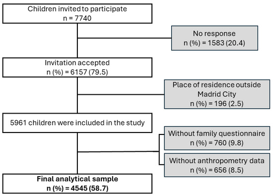 A multi-stage cluster sampling technique with stratification of the first-stage units was used for sample selection. To achieve a minimum sample of 5500 children, the schools (first stage) were stratified into four strata (high development, mid-high development, mid-low development, and low development) based on the socio-economic development of the district they belonged to. This classification was made according to three indicators of socio-economic development: (i) life expectancy at birth, (ii) percentage of residents aged 30 to 64 years with education level above secondary school degree, and (iii) gross income per capita. The schools’ selection was carried out by sampling with probability proportional to size (measured in terms of the estimated number of kindergarten and primary school students per center). A total of 84 centers were contacted, from which a valid sample of 60 centers (71.4%) was obtained (27 public schools and 33 private schools). Between 5 and 6 classrooms per school (with only one classroom per course between first year of kindergarten and sixth year of primary school) were randomly selected (second stage), obtaining a sample of 336 classrooms. The 7740 children enrolled in the selected classrooms (third stage) received an invitation to participate in the study. Finally, 4545 children accepted the invitation to participate, provided the questionnaire completed by their parents/carers, and attended the anthropometric assessment (Figure 1).