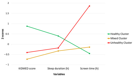The present study identified three lifestyle clusters combining diet quality, sleep duration, and screen time: a HC, a MC, and an UC. In line with these results, unhealthy clusters combining lower adherence to Mediterranean Diet, lower sleep duration, and higher screen time have been previously described in the Spanish population aged 7–17 years [29]. Analyzing characteristics of children belonging to each cluster, older children were more represented in the unhealthier cluster. In the present results, the UC is characterized by significantly higher screen time than the other clusters, and previous studies have shown an increase in screen time and sedentary behavior from childhood to adolescence [30,31,32]. This fact, combined with the existing evidence that high screen time is associated with other poor lifestyle habits, such as poorer diet quality [33,34], supports our findings of poorer lifestyles in older children. Furthermore, as this sample includes children aged 3 to 12 years, older children are transitioning into adolescence, which is a period strongly associated with a decline in healthy lifestyle behaviors [35,36] due to a higher exposure to social media, advertisements for unhealthy foods, and increased autonomy around decisions related to lifestyle [36,37]. In the present study, boys were more represented in unhealthier clusters, which contrasts with previous studies in which girls showed unhealthier lifestyle patterns than boys [38]. However, previous systematic reviews highlight that most of the children had mixed lifestyle patterns, with boys more represented in clusters including high physical activity and poor diet quality, while girls were more represented in clusters including high sleep duration and diet quality [15,39], as observed in the present study.