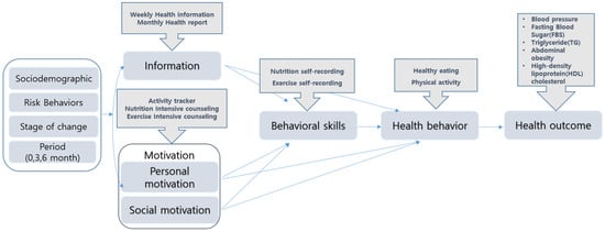 Information encompasses knowledge regarding disease etiology, symptoms, treatment procedures, and behavioral practices, as well as technical details enabling the independent acquisition of necessary information [31]. Weekly health information provided through this service included disease-specific insights vital for participants with risk factors for metabolic syndrome, guidance on appropriate physical activities, exercise videos, low-sodium diet cooking tutorials, dietary guidelines, and interpretation of nutritional information. A continuous variable was employed to determine the frequency of checking the weekly health information sent to the participant (1 to 24 times). Subsequently, a monthly report on health status trends (blood pressure, blood glucose, and body fat) and health behavior patterns (achievement rate of goals, exercise duration, cumulative distance traveled, and calorie intake), accompanied by expert opinions, was received for six months. The frequency of utilization (ranging from one to six times) constituted an information variable.