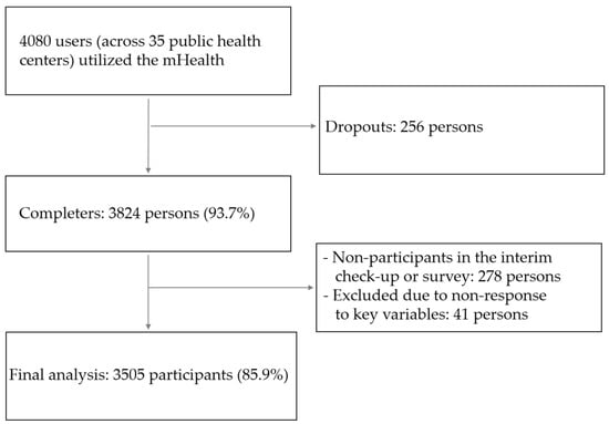 In this study, mHealth participants who completed all surveys and clinical measurements during three visits to public health centers were included. Of the 4080 initial participants, 3505 (85.9%) were included in the analysis, after accounting for dropouts and missing data (Figure 4).