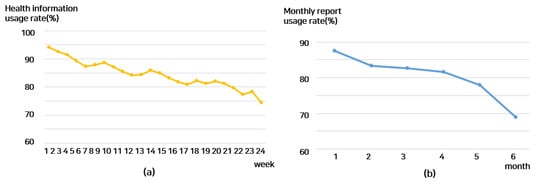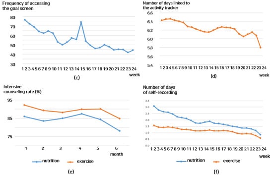 The usage trends of each intervention among mHealth recipients over the six-month (24-week) period were as follows (Figure 5): The health information usage rate was 94.1% in week 1 but decreased to 86.0% in the 12th week and 74.4% in the 24th week. The monthly report rate was maintained from 87.6% at one month to 82.6% at three months but decreased to 68.9% at six months. Next, the weekly frequency of accessing the goal screen, which tracks various activity metrics (such as steps, calories burned, exercise time, and moderate exercise), was examined. It decreased slightly from 76.3 times at week 1 to 55.8 times at week 12 and then to 74 times at week 13 and to 44.4 times at week 24. The number of days linked to the activity tracker remained at 6.4 days at week 1 and 6.1 days at week 12 but decreased to 6.1 days at week 23 and 5.8 days at week 24. Participation in intensive nutrition counseling, held once a month, decreased to 86% at one month, 84.9% at three months, and 78.1% at six months. Participation in intensive exercise counseling was 92.1% at one month, 88.2% at three months, and 84.8% at six months. Meanwhile, examining nutrition self-recording and exercise self-recording, nutrition self-recording was 3.1 days at week 1, 2.8 days at week 2, 1.8 days at week 12, 1.2 days at week 23, and tended to decrease to 0.8 days at week 24. Exercise self-recording gradually decreased to 1.6 days at week 1, 1.2 days at week 12, and 1.0 days at week 19 and then decreased to 0.8 days at week 23 and 0.6 days at week 24.