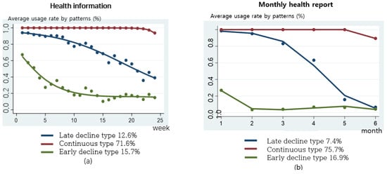 Health information and monthly reports were categorized into three types (Figure 6). The types of health information checking are as follows: the continuous type, 71.6%; the late decline type, 12.6%; and the early decline type, 15.7%. The monthly report showed the continuous type, 75.7%; the late decline type, 7.4%; and the early decline type 16.9%.